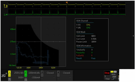 示波器的測試應用非常簡單,使用電壓、電流探頭正常測試開關管的VDS和IDM,并打開SOA分析功能,對照數(shù)據(jù)手冊的SOA數(shù)據(jù)設置好示波器的SOA參數(shù)即可。一但波形觸碰到安全區(qū)以外的區(qū)域,就說明器件超額工作,存在危險。